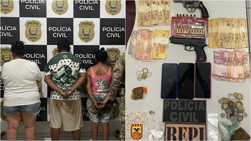 Além desse crime, o trio preso, formado por duas mulheres e um homem, deve responder por porte ilegal de arma de fogo e associação criminosa. Durante a execução dos mandados, a guarnição encontrou dinheiro em espécie, munições intactas, celulares, armas de fogo, simulacro e drogas em posse do trio.