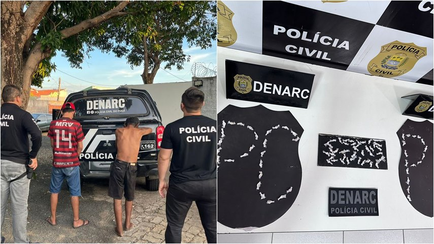 A Polícia Civil do Piauí deu cumprimento, na tarde de terça-feira (9), a mandado de busca e apreensão no bairro Extrema, zona sudeste de Teresina. Dois homens de iniciais C.A.G. de O. e F.E.C. foram presos em flagrante por suspeita de tráfico de drogas. A ação foi realizada pelo Departamento Estadual de Repressão ao Narcotráfico (DENARC).
