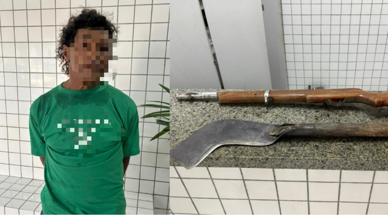A equipe policial se deslocou até o endereço para apurar a denúncia e identificar o agressor. No local, moradores apontaram o suspeito, D. da S. S., que foi imediatamente imobilizado e desarmado. Ele estava batendo no portão da vítima e portava uma arma de fogo de fabricação caseira.