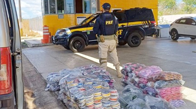 Na inspeção do compartimento de carga, foram encontrados 1.328 pares de calçados (sandálias populares). Questionados sobre a documentação, os ocupantes apresentaram nota fiscal eletrônica e manifesto de carga já utilizados anteriormente, o que descaracterizou a validade do documento.