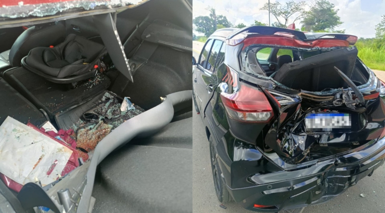 Apesar do impacto, o bebê estava bem e consciente. O policial militar sofreu ferimentos e recebeu atendimento no local.
