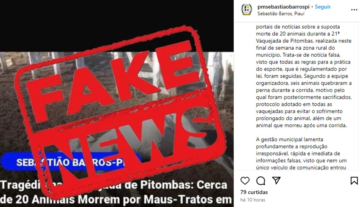 A Prefeitura de Sebastião Barros vem a público esclarecer sobre a divulgação de fake news, informações inverídicas, disseminadas nas redes sociais e em portais de notícias sobre a suposta morte de 20 animais durante a 21ª Vaquejada de Pitombas, realizada neste final de semana na zona rural do município. Trata-se de notícia falsa, visto que todas as regras para a prática do esporte, que é regulamentado por lei, foram seguidas. Segundo a equipe organizadora, seis animais quebraram a perna durante a corrida, motivo pelo qual foram posteriormente sacrificados, protocolo adotado em todas as vaquejadas para evitar o sofrimento prolongado do animal, além de um animal que morreu após uma corrida.