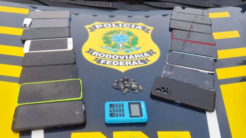 Questionados sobre a presença de possíveis ilícitos ou entorpecentes, os homens negaram e afirmaram que poderia ser feita uma vistoria no interior do veículo. Durante a busca, a equipe encontrou diversos volumes envolvidos com papel alumínio no compartimento de bagagem, contendo 16 celulares, 44 cartões de memória em um recipiente de plástico e uma maquineta de cartão.