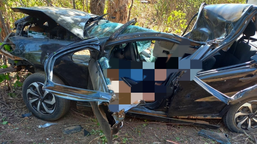 O carro em que Francisco Leandro dirigia ficou completamente destruído. O corpo da vítima ficou preso às ferragens.