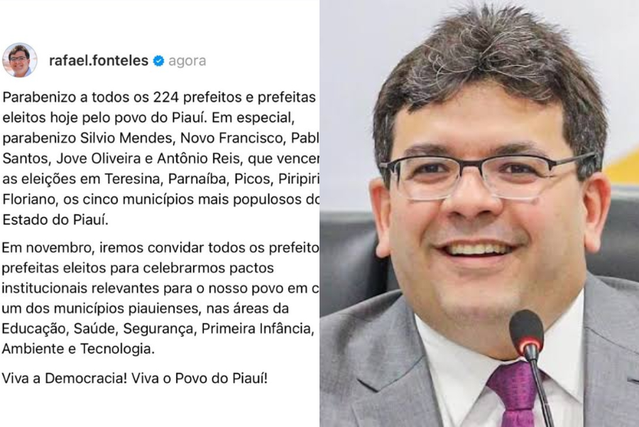 Com a apuração das urnas quase encerrada no Piauí, o governador do Piauí, Rafael Fonteles (PT), usou suas redes sociais para parabenizar os novos prefeitos de Teresina e de outras 223 cidades do estado, todos eleitos no primeiro turno. Fonteles destacou a importância da escolha popular, expressando sua satisfação pela participação cidadã no processo eleitoral. "Parabenizo a todos os 224 prefeitos e prefeitas eleitos hoje pelo povo do Piauí", escreveu o governador.