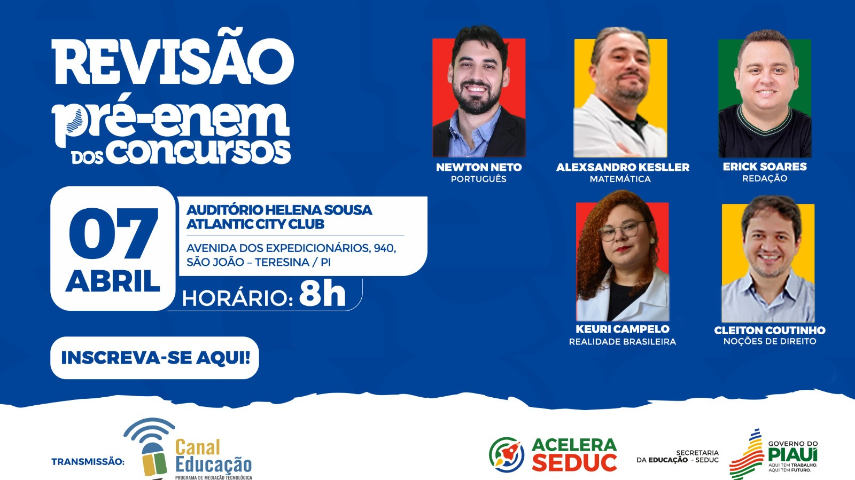 O QUE VOCÊ PRECISA SABER: O aulão é uma ação gratuita realizada pela Secretaria de Estado da Educação do Piauí (Seduc/PI) e que ocorrerá no Auditório Helena Sousa, no Atlantic City Club, a partir das 8h. Realize aqui sua inscrição.
