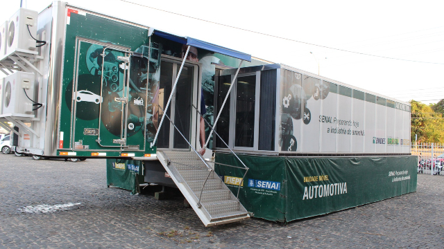 A Unidade Móvel Automotiva do SENAI, equipada com um laboratório de oficina mecânica de veículos leves, atenderá às demandas de qualificação profissional na Feira dos Municípios, oferecendo cursos como: