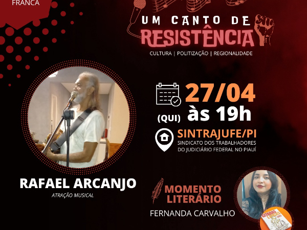 Nesta quinta-feira (27/04), às 19h, será realizada mais uma edição do projeto cultural “Um Canto de Resistência”, promovido pelo Sindicato dos Trabalhadores do Judiciário Federal no Piauí (SINTRAJUFE/PI), na sede da entidade, às 19h.