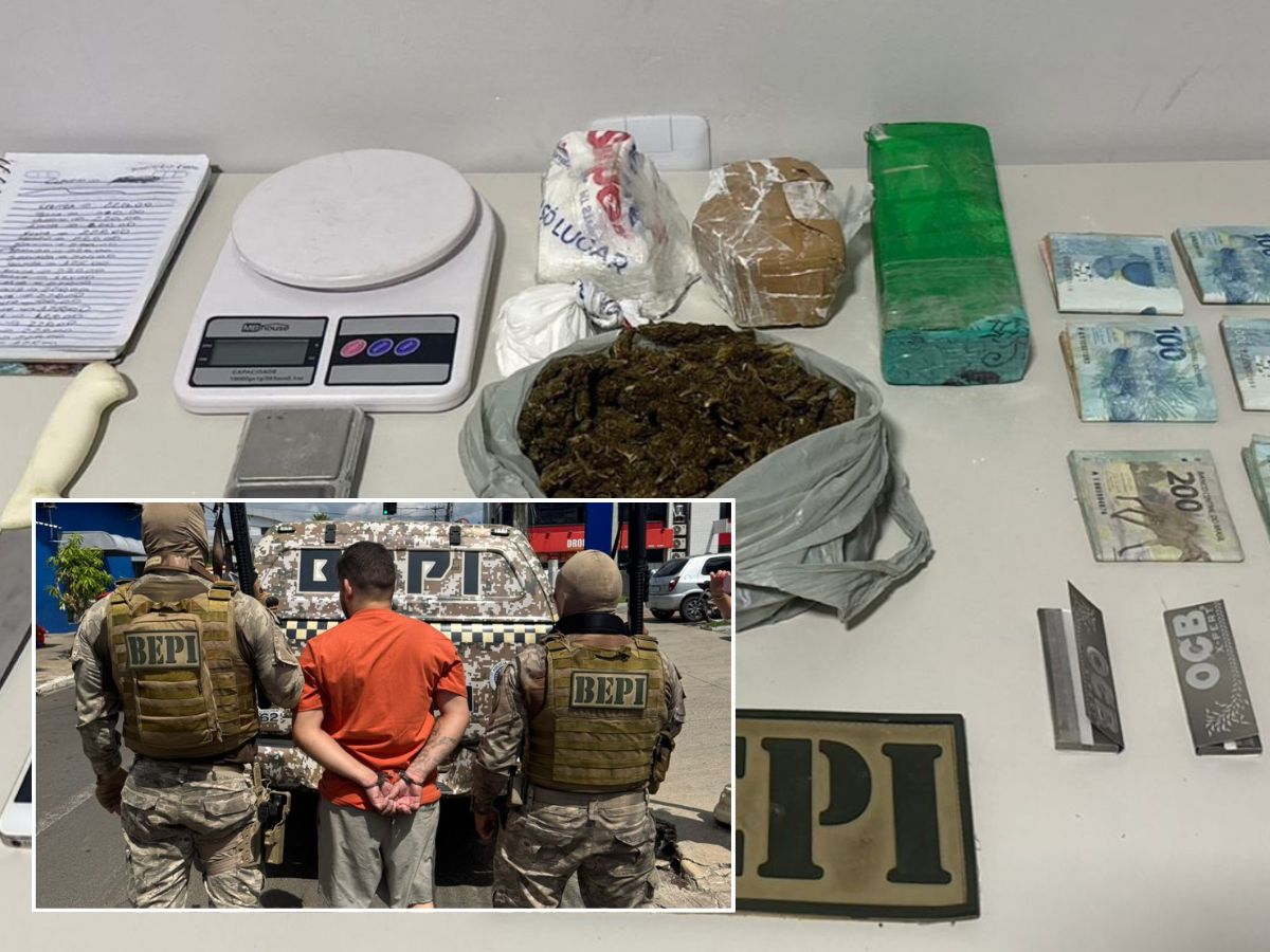 No local, os policiais encontraram cerca de 800 gramas de maconha, 900 gramas de cocaína, duas balanças de precisão, uma faca, fita adesiva, um caderno com anotações e R$ 8.350,00 em dinheiro vivo.