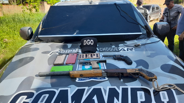 As armas são duas pistolas do assalto, uma escopeta calibre 12 e uma quarta, de fabricação caseira. Uma televisão que seria do assalto a residência do policial foi recuperada na incursão. Os indivíduos e todo o material foi encaminhado para a Central de Flagrantes para os procedimentos cabíveis.