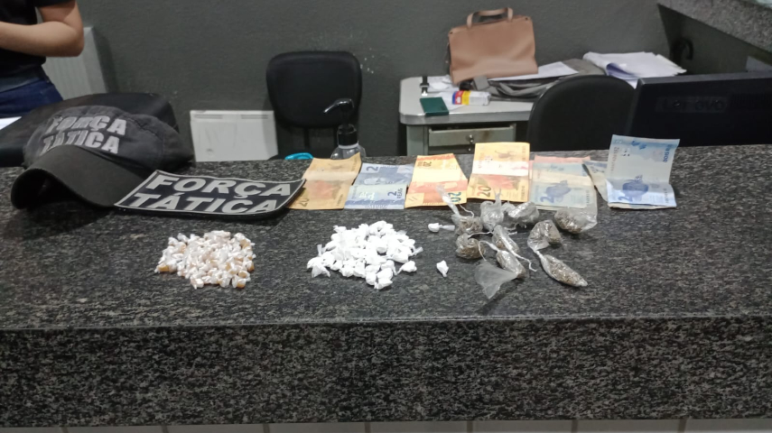 Com os homens, a polícia apreendeu cerca de 96 pedras de crack, 50 porções de cocaína, 14 invólucros de maconha e R$ 90,00 em espécie foram encontrados.