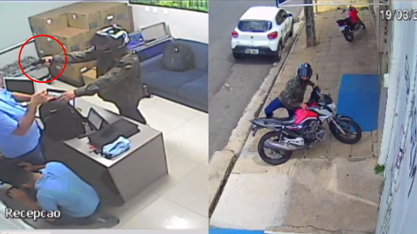 O ASSALTO. Na ocasião, os funcionários, um sentado e o outro em pé, colocam as mãos para cima, nisto o homem, ainda de capacete, entrega uma mochila e força um deles a ficar de joelhos. Empunhando a arma, o suspeito os conduz para outra sala. Quase dois minutos depois, após subtrair R$ 25 mil em espécie, o homem sai do local na motocicleta em destino ignorado. O valor seria utilizado para o pagamento de um boleto da empresa de medicamentos.