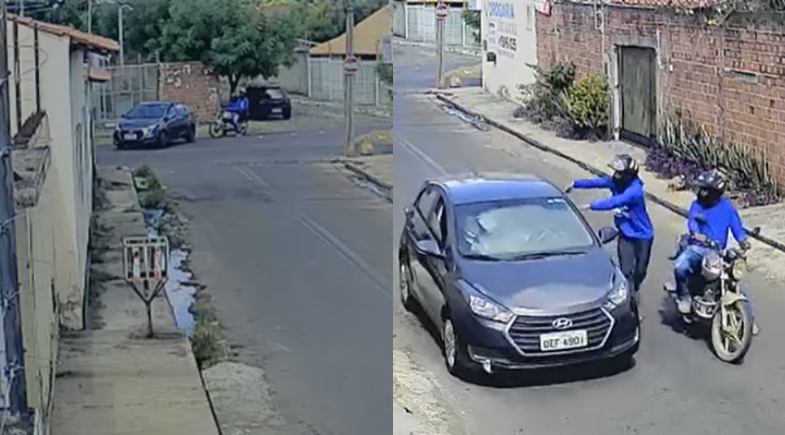 Nas imagens, é possível ver que o casal, que estava em um carro modelo HB20, era seguido por dois homens em uma motocicleta. Às 14h16, o garupa desce armado, aponta a arma para o motorista e anuncia o assalto.