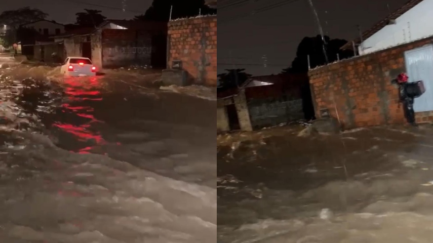 Vídeos registrados por moradores do bairro Satélite, situado na zona Leste de Teresina, mostram ruas alagadas e com correntezas intensas. Em uma das gravações, um homem tenta ajudar um entregador de delivery, que procura um local elevado na calçada de uma residência para se proteger da força da água.