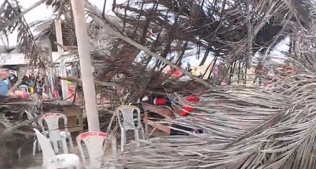 Turistas que aproveitavam a tarde de praia gravaram um vídeo que mostra a estrutura de madeira e palha de carnaúba parcialmente destruída. Pelas imagens, é possível ver que havia várias cadeiras e mesas de plástico sob a cobertura.