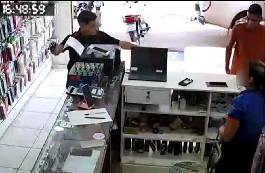 Era por volta das 16h48min10s, conforme imagens de câmeras de monitoramento, quando dois suspeitos entram no estabelecimento. Enquanto um dele, de camisa laranja, conversa com a atendente, o outro se distancia para o fundo, procurando a arma de fogo na mochila.