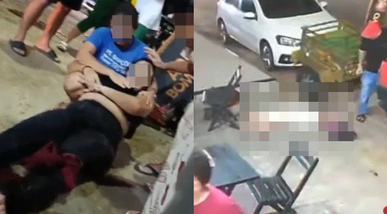 Durante a ação criminosa, a criança é baleada e cai ao chão, enquanto os demais presentes correm para prestar socorro e fugir dos disparos.