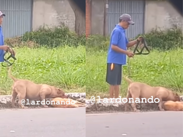 A Associação de Proteção Animal Lar do Nando relatou, em vídeo publicado nas redes sociais, que o senhor, conhecido como Edilson, estava capinando um terreno no bairro, quando flagrou o pitbull em cima do vira-lata. Ele pegou algumas correntes e cordas e conseguiu resgatar o cachorro.
