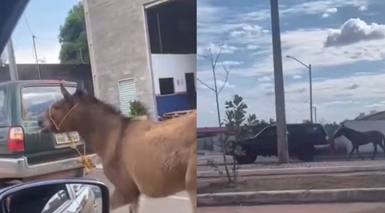 Na tarde desta segunda-feira (23), um motorista flagrou uma cena revoltante de maus-tratos a um animal na Avenida Zequinha Freire, Zona Leste de Teresina. Um jumento foi visto sendo puxado por um carro em movimento, amarrado pela cabeça à traseira do veículo. As imagens geraram revolta nas redes sociais e indignaram os internautas.