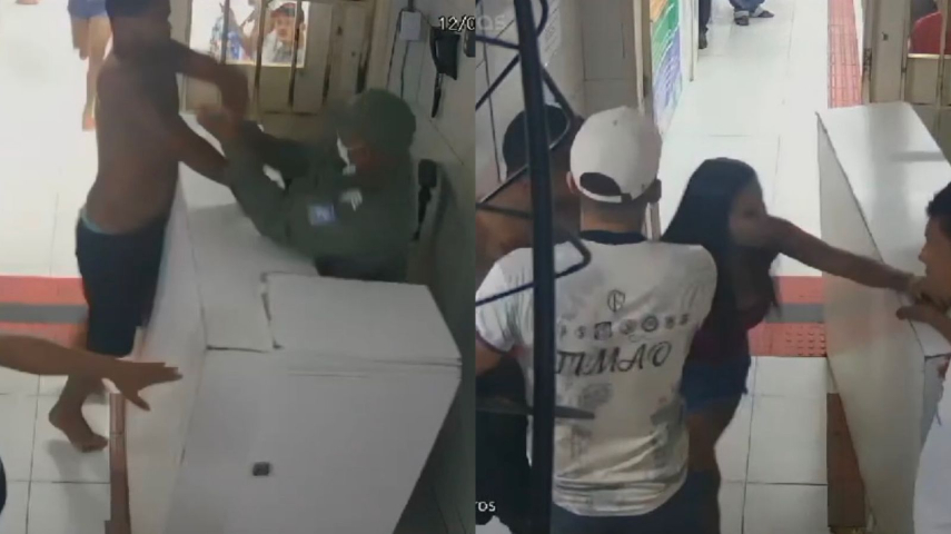 O QUE ACONTECEU: Nas imagens que mostram a confusão, um homem aparentemente discute com um policial no balcão de atendimento da UPA do Satélite. Segundo depois, o policial dá um empurrão nele, que se desequilibra e se apoia em uma parede. Em seguida, o homem tenta revidar com um tapa no braço do policial, que o empurra novamente.