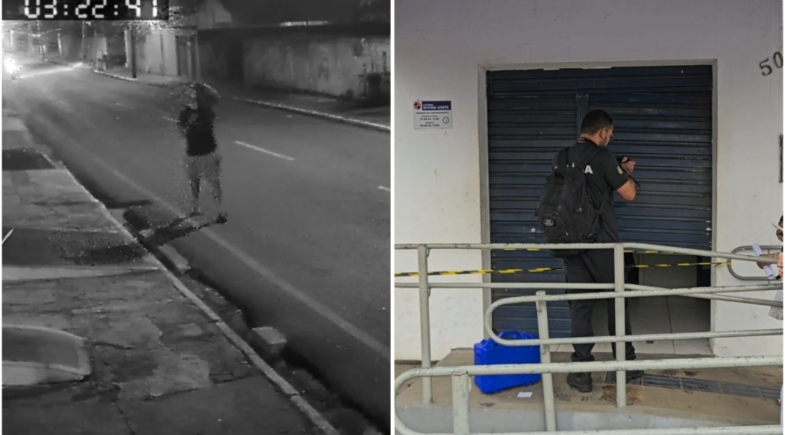 De acordo com as imagens, o suspeito chega sozinho ao local por volta de 1h53, usando capuz. Ele permanece no estabelecimento por mais de uma hora e deixa o local às 3h20, carregando uma bolsa nas costas.