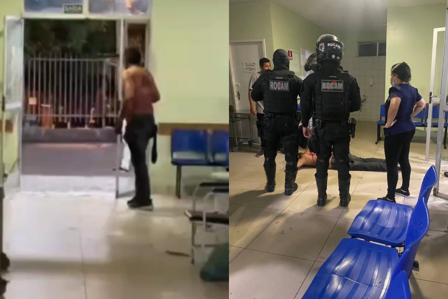 Um vídeo obtido pelo MeioNews mostra o suspeito sem camisa próximo à porta, ameaçando dois homens e outros pacientes que estavam no Hospital Regional de Picos.
