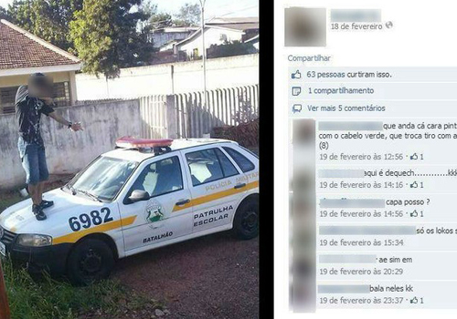 Um adolescente de 17 anos foi apreendido na tarde desta segunda-feira (24), depois de postar uma foto em que aparece em cima do capô de um carro da Patrulha Escolar de Londrina, no norte do Paraná. Na imagem publicada no Facebook, ele simula atirar contra o veículo, estacionado próximo a uma escola, na zona sul do município.