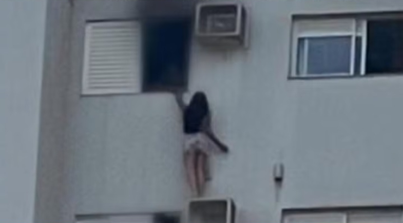 Apartamento pega fogo e mulher se pendura em ar-condicionado para salvar mãe e criança; vídeo