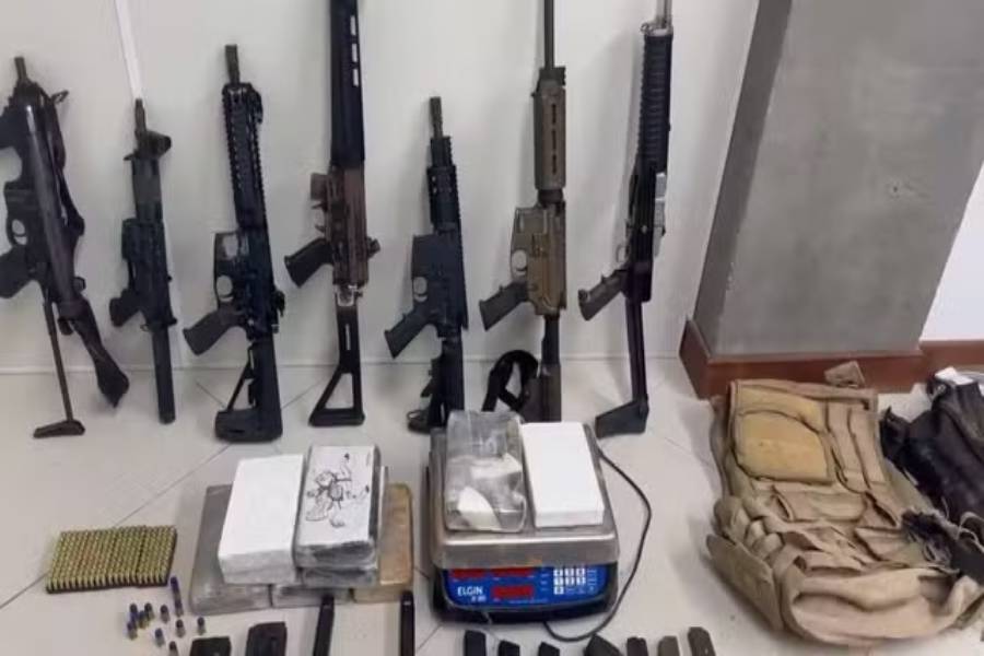 Considerada a maior apreensão de armas de 2024, o material estava escondido em uma área de matagal, na localidade do Caji, de difícil acesso. As armas, munições, drogas e coletes foram encaminhados para a sede do Depom.