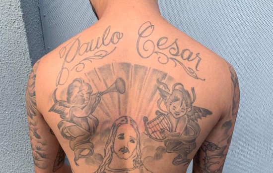 Um homem foragido da Justiça foi capturado pela Polícia Militar de São Paulo na última quinta-feira (10) para cumprir pena de 20 anos de prisão por ter matado um sargento da PM aposentado, em São Vicente, no litoral de São Paulo. Mas o que nem mesmo os policiais que efetuaram a prisão esperavam era que o nome da vítima, "Paulo Cesar", está tatuado nas costas do foragido, acima de dois anjos tocando instrumentos e da imagem de Jesus Cristo.