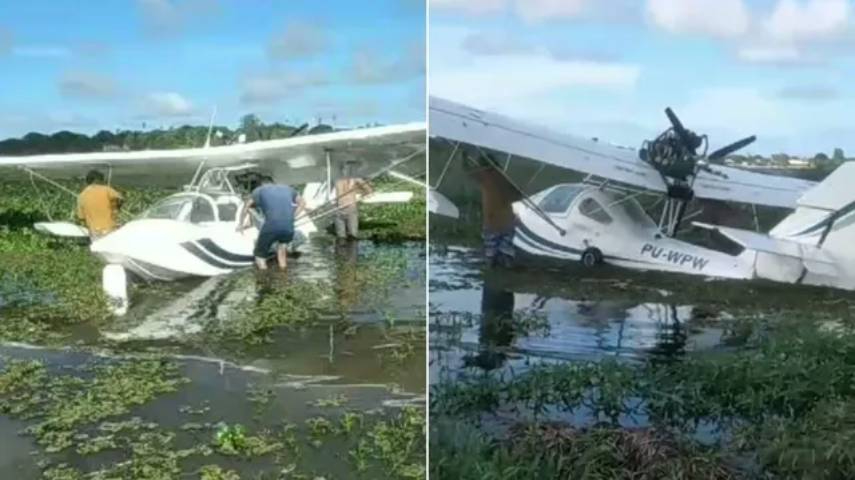 Um avião de pequeno porte precisou fazer um pouso forçado no Rio Catu, em Aquiraz, município da Região Metropolitana de Fortaleza (CE). O acidente ocorreu na manhã deste domingo (10) e, na ocasião, havia duas pessoas na aeronave. Felizmente, ninguém ficou ferido.
