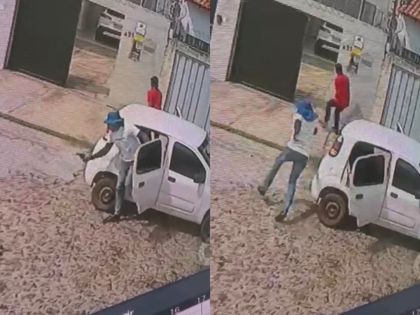 Nas imagens, é possível ver que uma pessoa em um HB20 entra em casa e fecha o portão, mas os criminosos aparecem logo em seguida em um Fiat Uno Branco e dois deles conseguem entrar na residência antes do portão fechar.