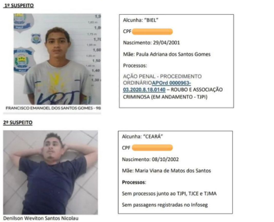 Francisco Emanoel dos Santos Gomes, mais conhecido como ‘Biel’, Denilson Weviton Santos Nicolau, o ‘Ceará’ e Antônio Cleison Barbosa Silva, o ‘Macapá’, são os criminosos que estavam no veículo modelo Renault Kwid azul quando abordaram o veículo que estava Flávia Wanzeler e seu namorado na Avenida Homero Castelo Branco, na zona Leste de Teresina, segundo o que apontou a investigação do Departamento de Homicídios e Proteção à Pessoa.