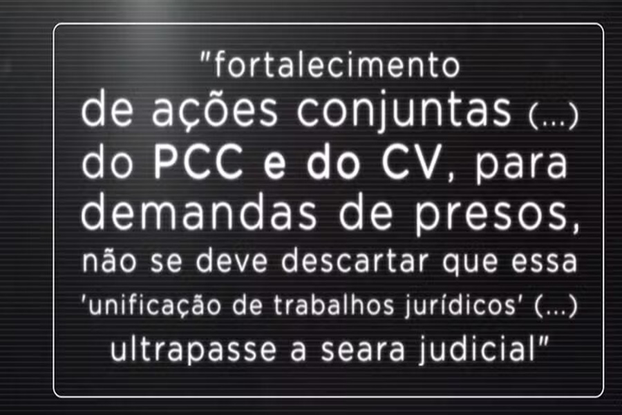 O relatório do Serviço de Inteligência do Ministério da Justiça, que o Fantástico teve acesso, aponta que os advogados das duas facções estariam se unificando. Essa ação, conforme o relatório, teria o objetivo de fortalecer o PCC e o CV, principalmente em relação a demandas que envolvem os líderes criminosos presos no sistema penitenciário federal.