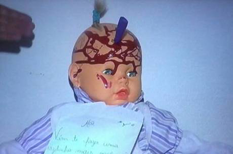 Uma mãe teve uma surpresa após registrar um boletim de ocorrência contra a própria filha e o genro no último sábado (11), numa delegacia do bairro Casa Branca, na região leste de Belo Horizonte. Ao chegar em casa, ela encontrou uma boneca em cima de um mesa, pintada com sangue falso e com uma faca enfiada na cabeça. Com o brinquedo, estava uma ameaça por escrito: "Mãe, vim te fazer uma visitinha, mas você não estava. Desculpe, deixei algumas baguncinhas, beijo".
