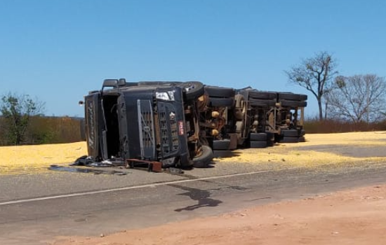 Uma carreta tombou no final da manhã desta sexta-feira (10), na BR 135, na cidade de Redenção do Gurgueia, no Sul do Piauí. O veículo transportava uma carga de milho, que se espalhou pela pista.