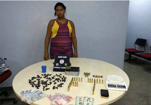 Uma jovem grávida, de 19 anos, foi presa com arma de uso exclusivo da polícia, munições e drogas no bairro Gilberto Mestrinho, Manaus (AM). A polícia chegou até ela depois de denúncia anônima feita por vizinhos.