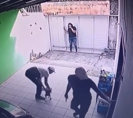 As câmeras de segurança mostram o momento em que a empregada doméstica é rendida por três pessoas (dois homens e uma mulher) e o cachorro é levado por um dos bandidos. Na residência, havia 4 pessoas no momento da ação dos criminosos.