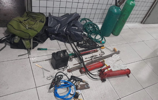 Com os suspeitos foram apreendidos um rifle, material explosivo, adesivos de placas, celulares, cilindros e máquinas de solda.
