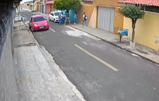 A câmera de segurança de uma residência registrou o momento em que os alunos foram abordados por um criminoso, que sai do banco do passageiro de um veículo modelo Ford Ka, de cor vermelha, corre em direção as vítimas e anuncia o assalto.