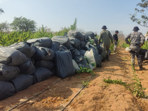 Ao todo, foram encontrados 100.000 pés da erva da espécie Cannabis sativa, além de 1.924 quilos de maconha, onde o produto estava ensacado e enterrado.