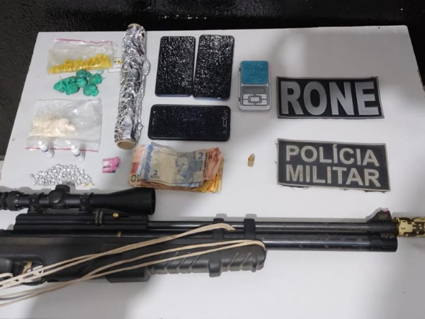 Polícia prende foragido do Maranhão com drogas e arma em Cajueiro da Praia (Foto: Reprodução)Durante as buscas, foram encontrados vários tipos de drogas e dinheiro em posse do acusado. Na varredura do perímetro, próximo onde os outros fugiram, foi encontrado uma carabina de pressão 5.5 da marca rossi, equipada com luneta e silenciador.