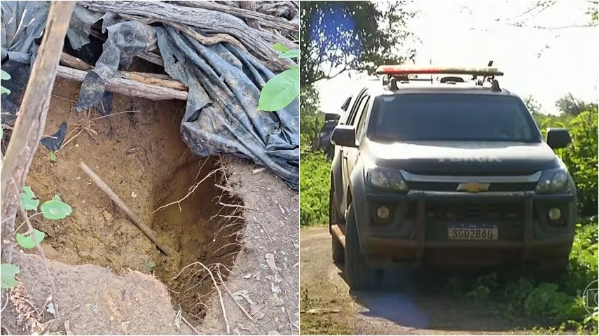 Próximo à residência, os peritos identificaram um buraco, aparentemente um bunker improvisado, destinado a evitar a detecção por drones que buscam calor humano. Além disso, foram encontradas redes para dormir, embalagens de comida, um facão e uma lona.