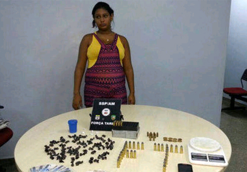 Uma jovem grávida, de 19 anos, foi presa com arma de uso exclusivo da polícia, munições e drogas no bairro Gilberto Mestrinho, Manaus (AM). A polícia chegou até ela depois de denúncia anônima feita por vizinhos.