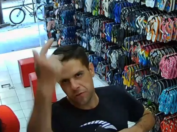 Um homem roubou uma loja de chinelos no Centro de São Vicente, no litoral de São Paulo. Um vídeo mostra toda a ação do criminoso que, em determinado momento, olha para a câmera e manda um recado: "pode filmar, estou f*dido mesmo". Minutos depois, ele foi preso.