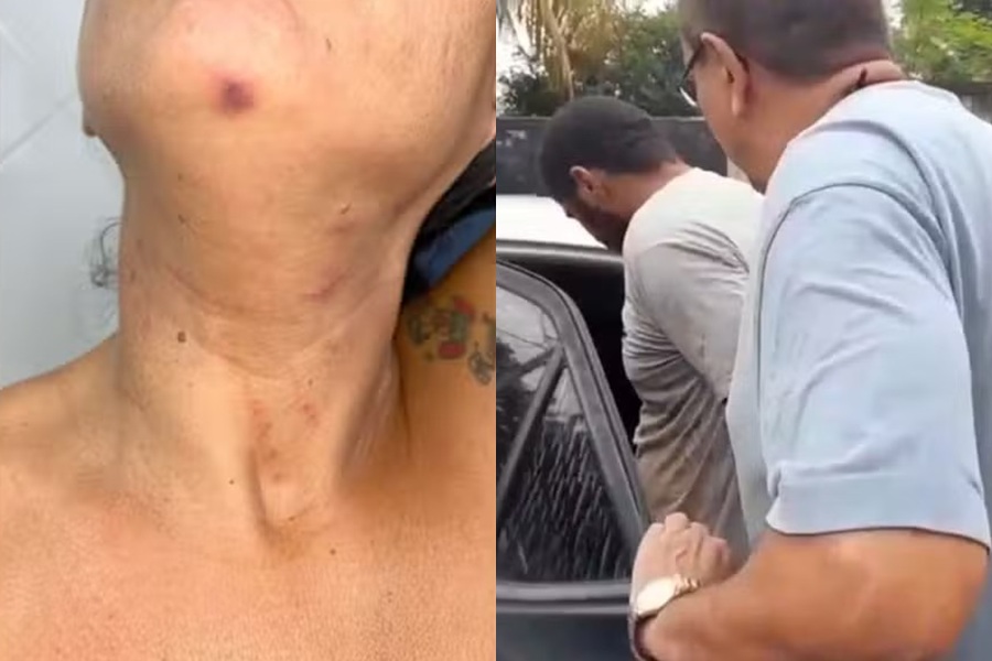 Como ele não gostou porque ela quis ir embora desse forró, quando chegou em casa deu uma rasteira nessa mulher, levou-a pelos cabelos até o quarto e o trancou. A partir daí houve uma sessão violenta de espancamento. Chutes, socos. Mas o pior são as marcas no pescoço, a esganadura. Ela ficou tonta, quase desmaiou, mas conseguiu se desvencilhar.