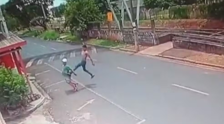 O crime foi registrado por um câmera de segurança. Segundo o boletim de ocorrência, o aposentado saiu para caminhar e, ao retornar, foi surpreendido com o homem que o atacou com um chute e lhe roubou o celular. Depois, o agressor fugiu.