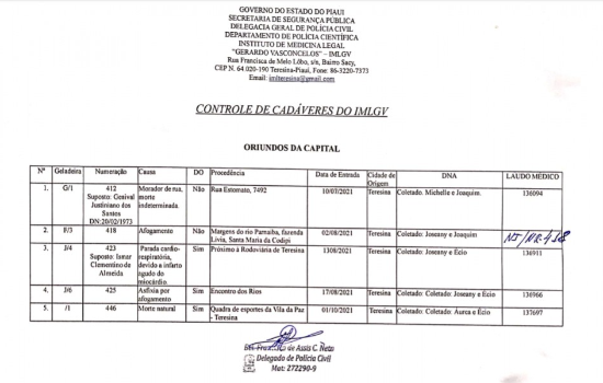 A Polícia Civil, atuando pelo Instituto de Medicina Legal, vem dar publicidade aos procedimentos para sepultamento de cinco corpos sob custódia daquele órgão. São cinco pessoas que foram encontradas mortas em Teresina, cujos familiares ou amigos não os reivindicaram, e já foram submetidas aos exames de DNA para identificação posterior, caso necessário.