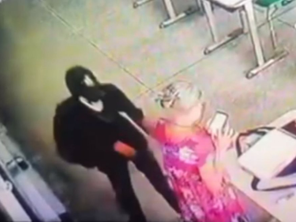 As imagens das câmeras mostram que o adolescente entra correndo em uma sala de aula e parte para cima da professora que estava em pé, atrás de uma mesa.
