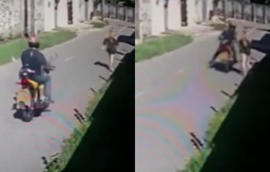 Após a ação, o homem foge. Já a vítima fica assustada e volta correndo pela rua. A moto usada pelo suspeito estava com a placa coberta por um pano.